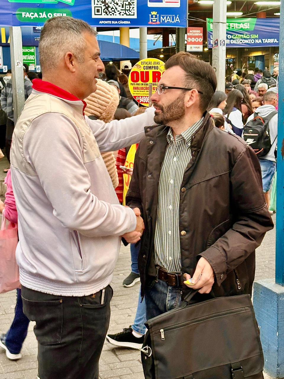 O candidato também esteve na Estação Ferroviária Central, abordando questões de transporte e infraestrutura e encerrou o dia na Feira Noturna do Parque São Vicente e no podcast “Mauá em Alerta”.