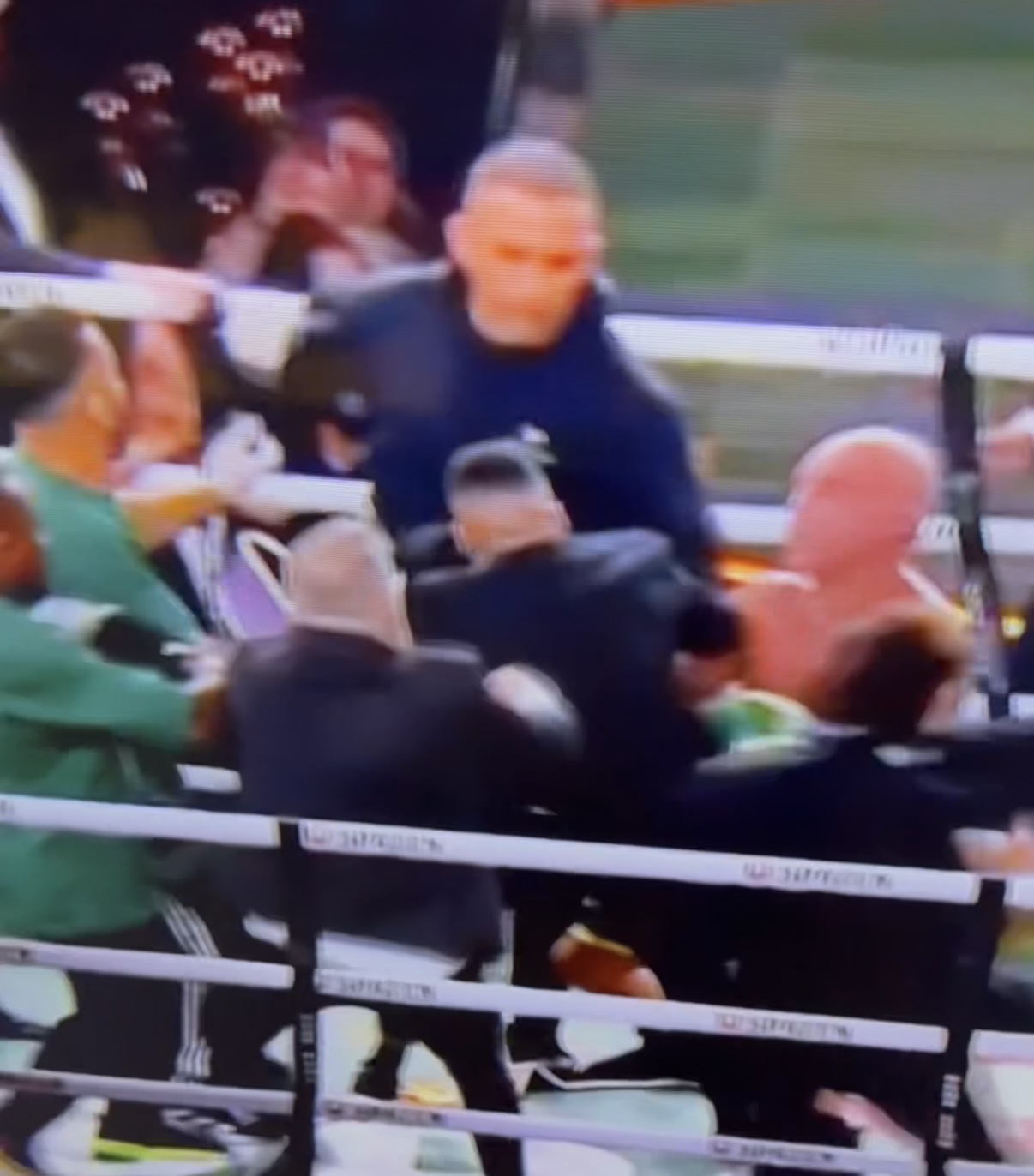 A luta foi encerrada com a desclassificação de Silva e a pancadaria entre as equipes começou.