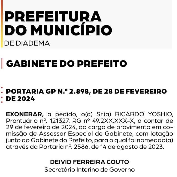 O ex-prefeiturável, Ricardo Yoshio (PSD), pediu exoneração do cargo de assessor na gestão do prefeito José de Filippi Jr (PT) em Diadema.